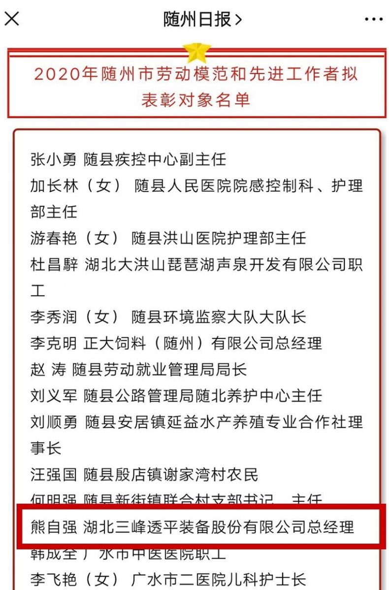 根據(jù)隨州市總工會(huì)《關(guān)于做好2020年隨州市勞動(dòng)模范和先進(jìn)工作者推薦評(píng)選工作通知》精神及評(píng)選推薦要求,經(jīng)市委、市政府同意,確定了88名隨州市勞動(dòng)模范和先進(jìn)工作者表彰對(duì)象,其中企業(yè)負(fù)責(zé)人15名。